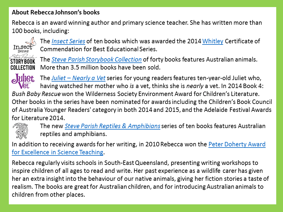 Rebecca’s purpose in telling these stories is to blend science with fiction in a way that engages children’s interest in wildlife and nature. She does it successfully. In 2014, the fourth in the series Bush Baby Rescue won the Wilderness Society Environment Award for Children’s Literature. This year, the most recent title Rainforest Camp received the same award.