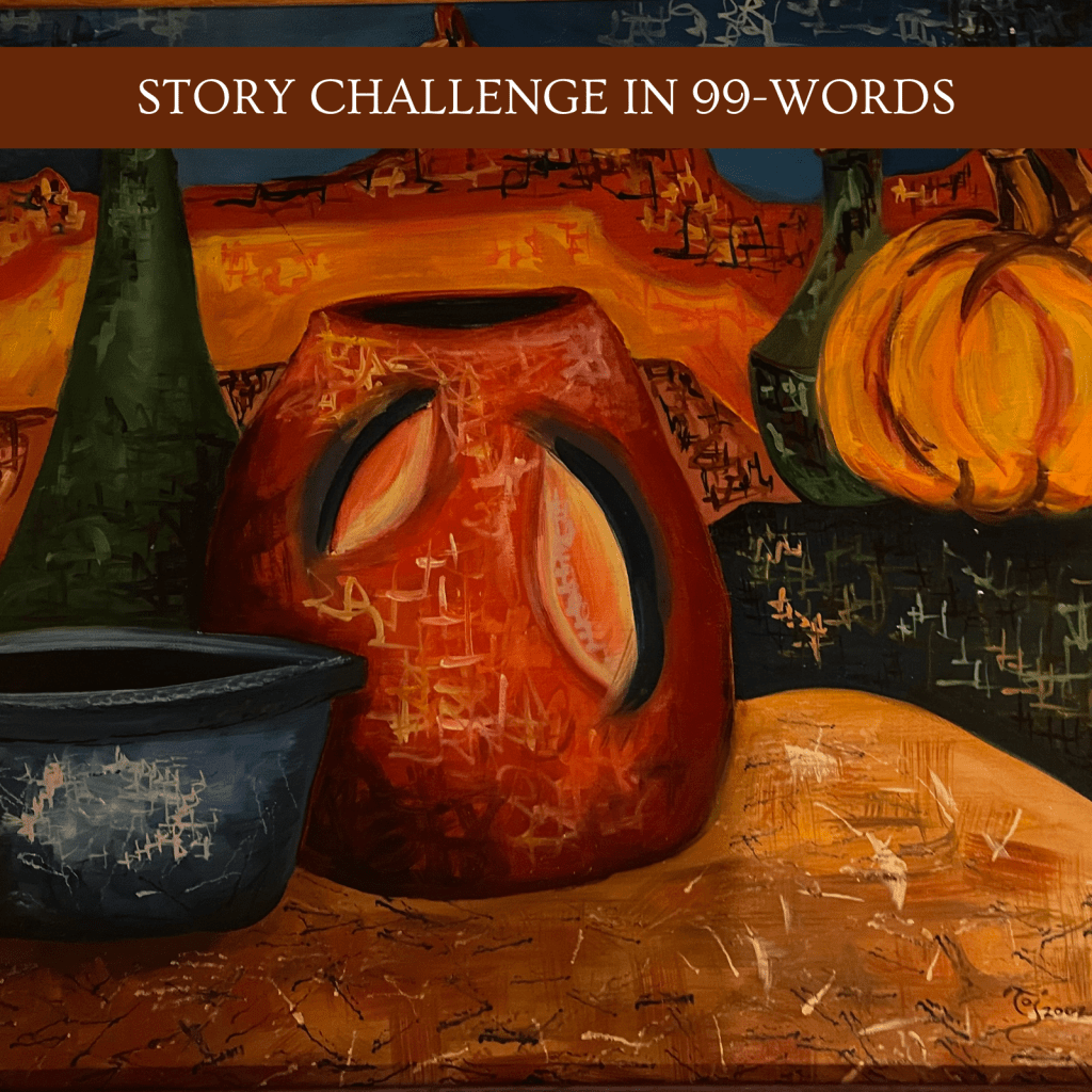 This week at the Carrot Ranch, Charli Mills challenged writers to: In 99 words (no more, no less), write a story that depicts the painting, “Southwest Pumpkins” by TOJ. Feel free to explore the nuances — do you focus on the art or seek a story? What vibes do you get? Who shows up to enter the image? What happens? Go where the prompt leads!