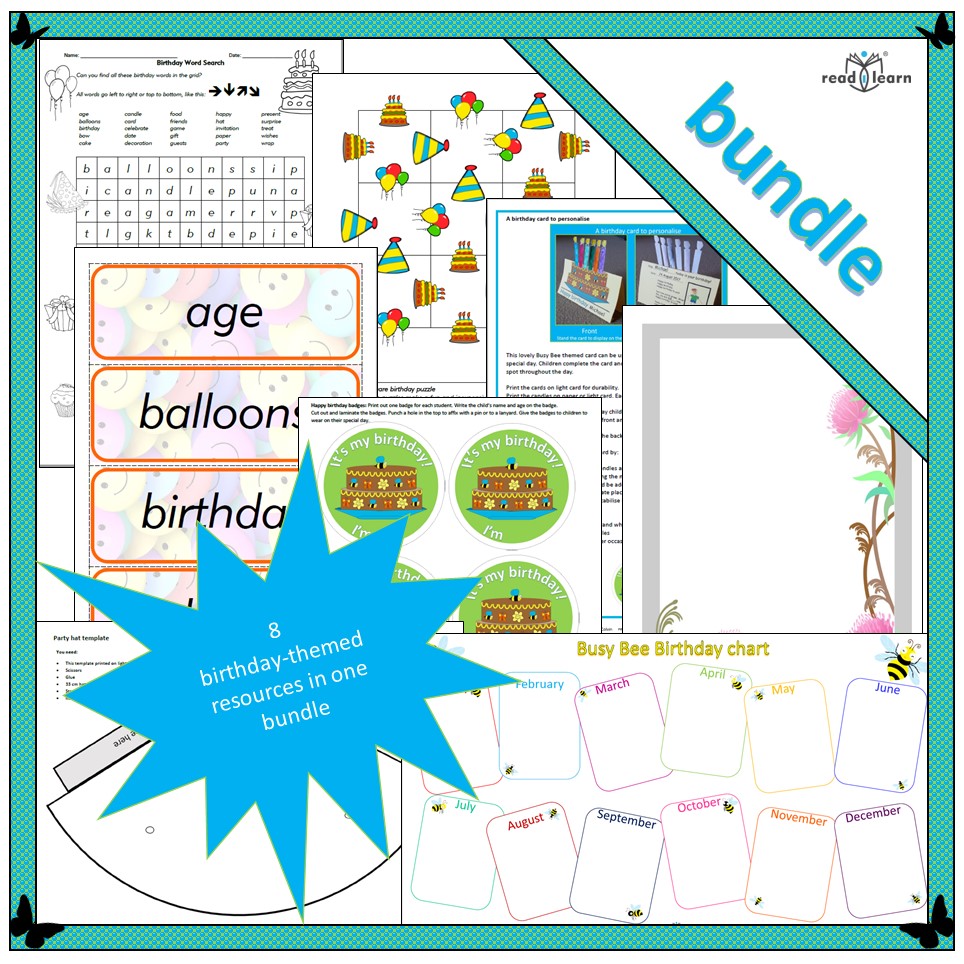 The bundle includes the following 8 birthday-themed printable resources in one easy-to-download folder (note they are only free when downloaded as part of the bundle).