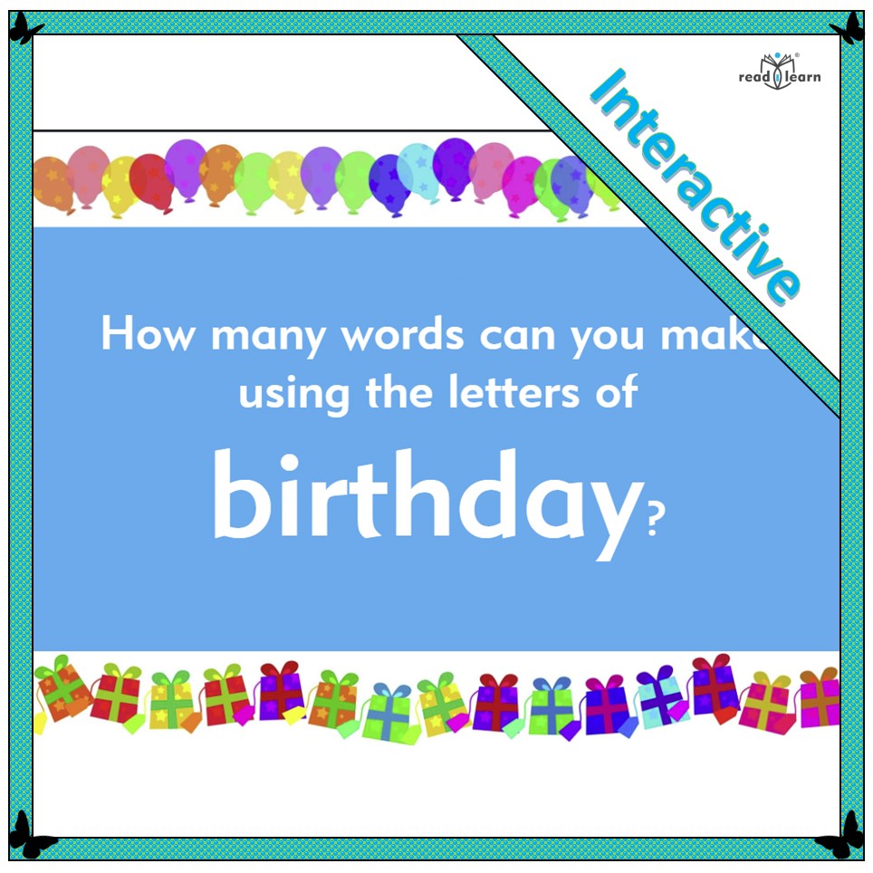 Make Words from the Word ‘Birthday’is a fun activity to do as a class on the interactive whiteboard. Children choose letters from the word ‘birthday’ to make other words. Each letter can be used only once. Words can be entered into the box using the keyboard. Work can be saved for another lesson if desired.